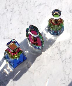 Subtle and delicate, this crystal bottle with geometric shapes is enhanced by a clear and precise crystal size. Handcrafted in clear crystal, we discover color effects that vary depending on the position of the bottle. A black fabric placed under the bottle gives these multicolored reflections to the crystal. Insert a few drops of your best perfume inside, a crystal stem allows you to deposit this subtle fragrance on the desired places.