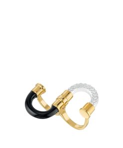 Cristal poli très lumineux. Le studio de création a travaillé sur plusieurs formes de cristal : en volume sur les boucles d’oreilles et le collier, en bas-relief sur les boutons de manchette et la broche.