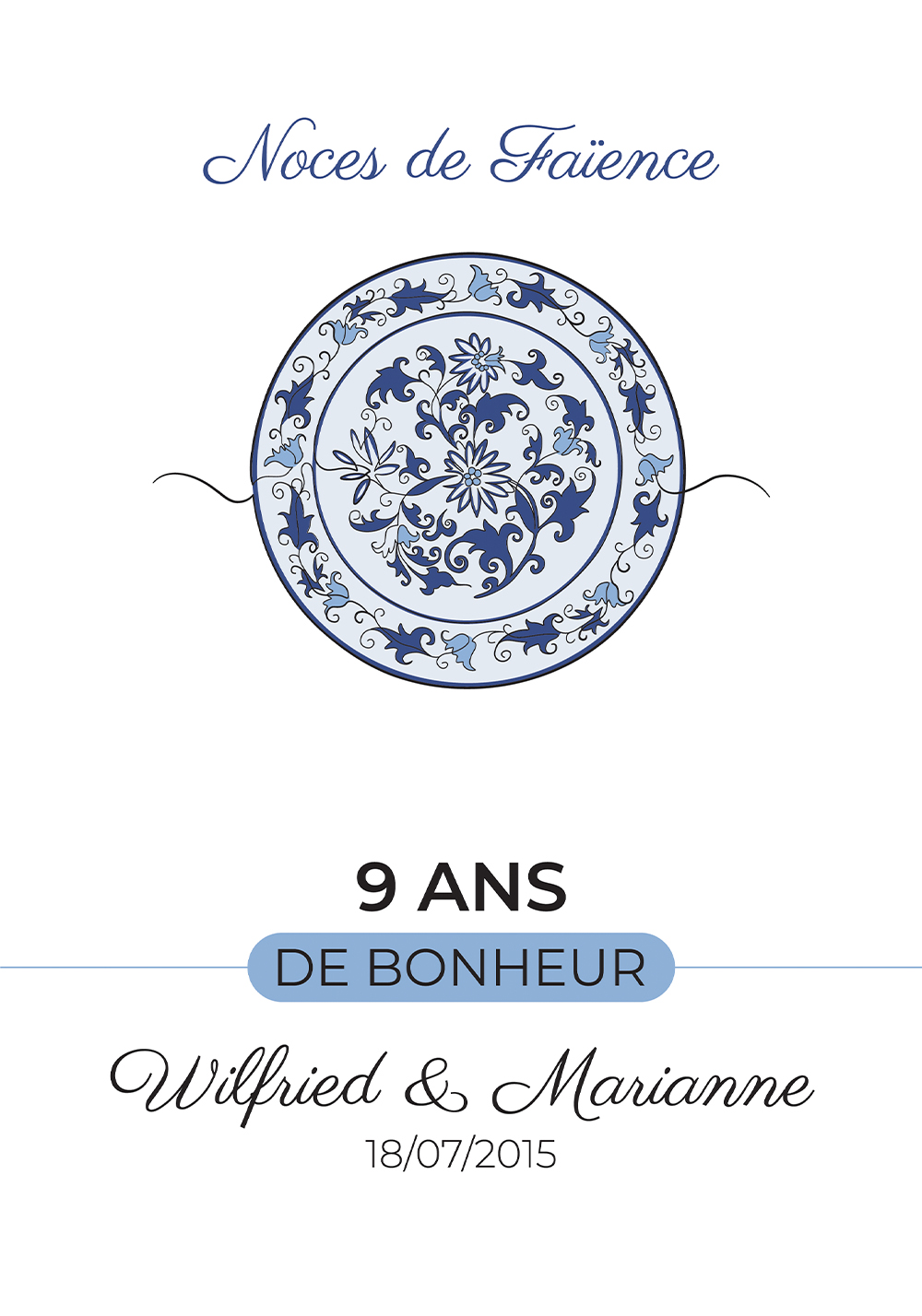 Cette affiche raffinée célèbre les 9 ans de mariage, connus sous le nom des Noces de faïence. Au centre, une élégante assiette en faïence bleue illustre avec finesse la solidité et la délicatesse de la relation, à l’image de ce matériau noble et fragile.